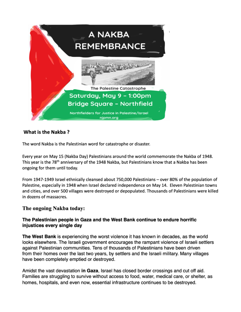 Northfielders for Justice in Palestine/Israel is thrilled to be able to make this exhibit available to other organizations and individuals who are interested in displaying the exhibit. The curators of this exhibit say: