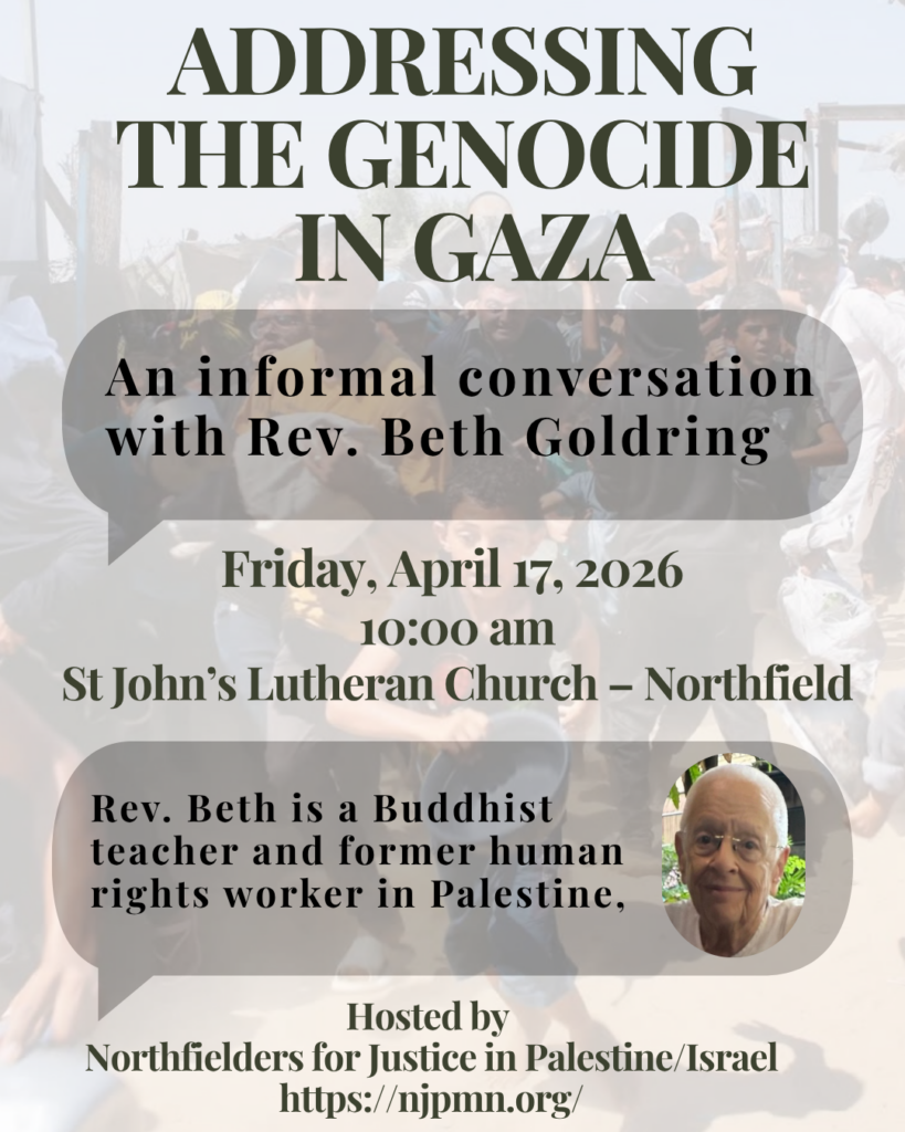 Northfielders for Justice in Palestine/Israel (NJP/I) is a local community group whose aim is to educate and inform Northfield and the surrounding area about the ongoing occupation of Palestine and to advocate peace and justice for all people who live in Palestine and Israel.